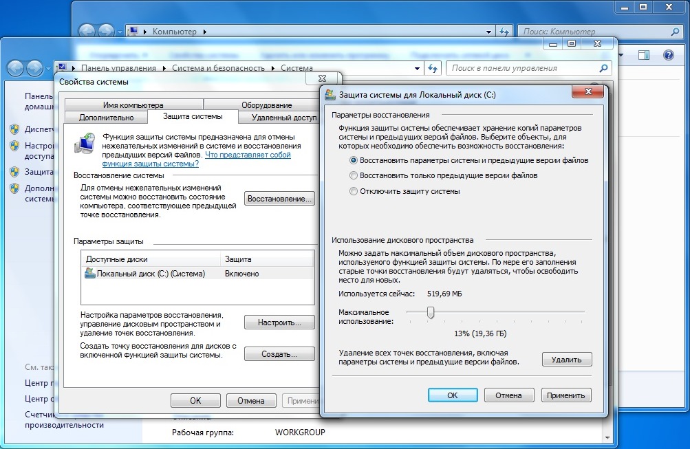 в котором нужно выбрать пункт «восстановить параметры системы и предыдущие версии файлов» и ползунком в процентах указать максимальное использование дискового пространства в гигабайтах под контрольные точки восстановления системы, лично я оставляю значение равным 13%. Затем нажимаем на кнопку «удалить», тем самым удалив старые точки восстановления системы. Далее «применить» и «ОК».